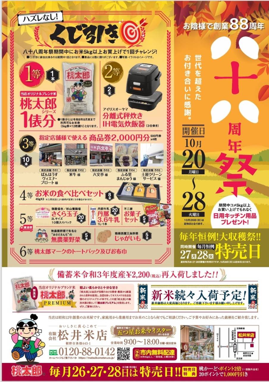 2025/10/08 大収穫祭2025 2025/10/09 今年もやります!!! 大収穫祭2025 10/20(月)~28日(火)開催 今年は八十八周年祭と同時開催のため 豪華景品を取り揃えております!! なんとい1等は当店でお使いいただける お米1俵ぶんの商品券です (桃太郎シリーズのに限る) ほかにも多数景品あり!! みなさまのお越しをお待ちしております♪